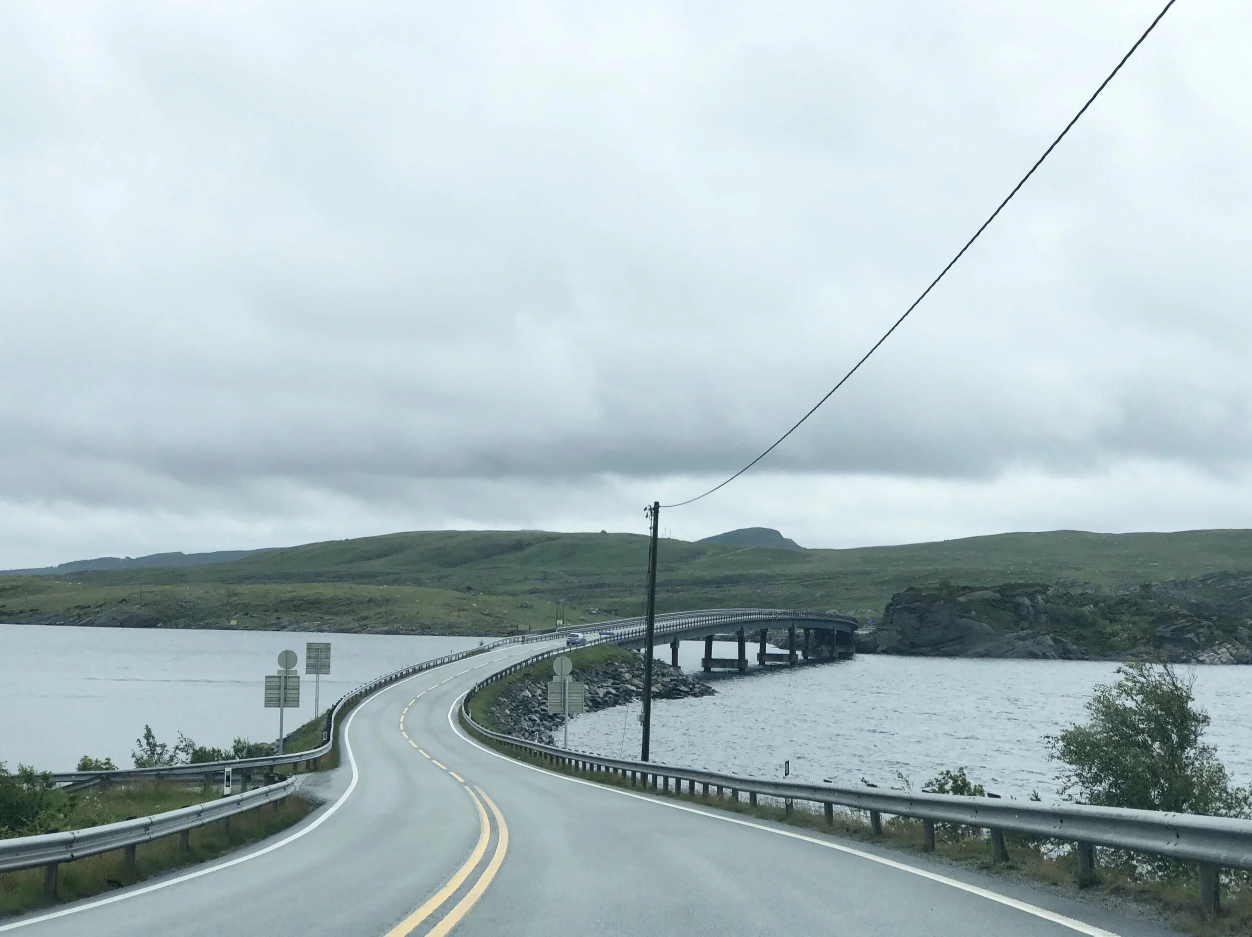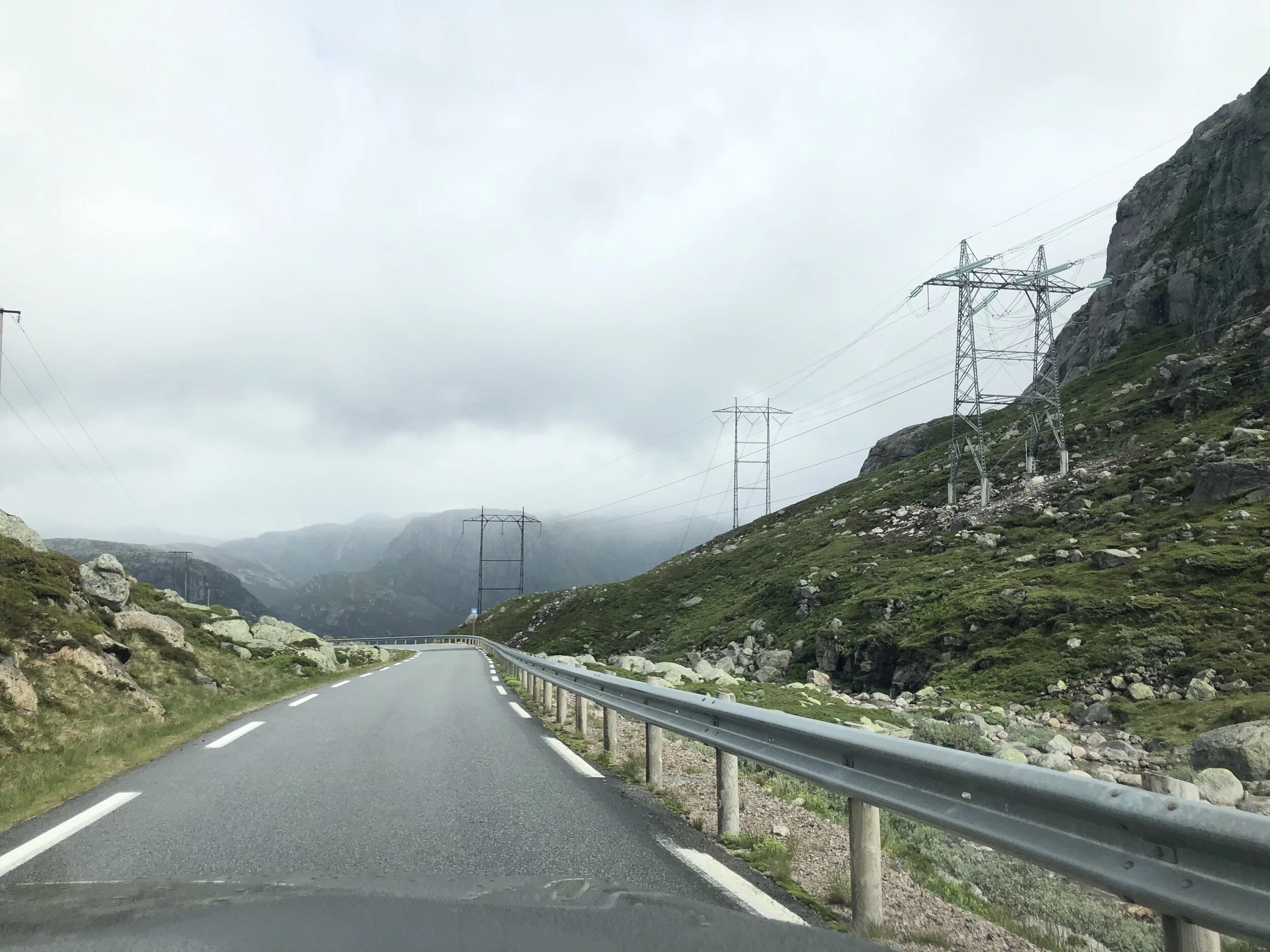 Malheureusement, la météo n’était toujours pas de notre côté pour ce trajet de 4 heures en voiture. En Norvège tout semble proche lorsqu’on regarde la distance entre un point A et un point B, mais il faut tenir compte de tous les obstacles, les montagnes, les ferries, les détours imposés par la nature et le relief sans compter les limites de vitesse qui ne dépassent jamais ou rarement les 80km/h. Ça ne rigole pas sur la vitesse en Norvège! Mais ce fut un 4 heures de pur bonheur quand même, ces fjords embrumés et ce ciel menaçant ne faisait qu’ajouter au spectacle. Une fois sur le premier ferry qui traverse le Bjørnafjord, c’est là qu’on a senti qu’en plus de la pluie et le vent, il faisait frette! Pas grave, j’aime le froid. En Norvège, on ne se plaint pas!